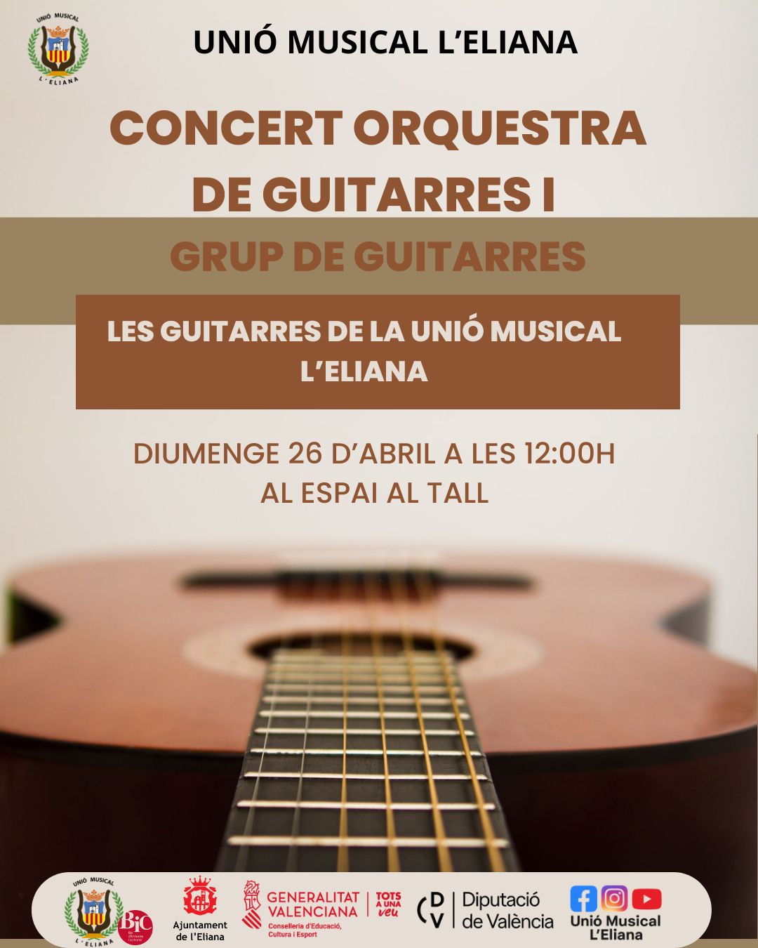 El pr貌xim diumenge 26 d鈥檃bril a les 12.00 h tindr脿 lloc el concert de l鈥橭rquestra de Guitarres i el Grup de Guitarres, sota el t铆tol 芦Les guitarres de la Uni贸 Musical L鈥橢liana禄.