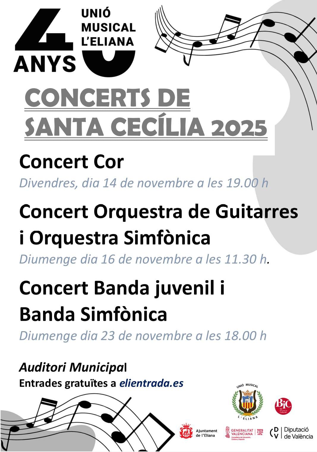 Us convoquem a participar en els concerts de Santa Cecília que enguany seran molt especials. La Unió musical L’Eliana compleix 40 anys.