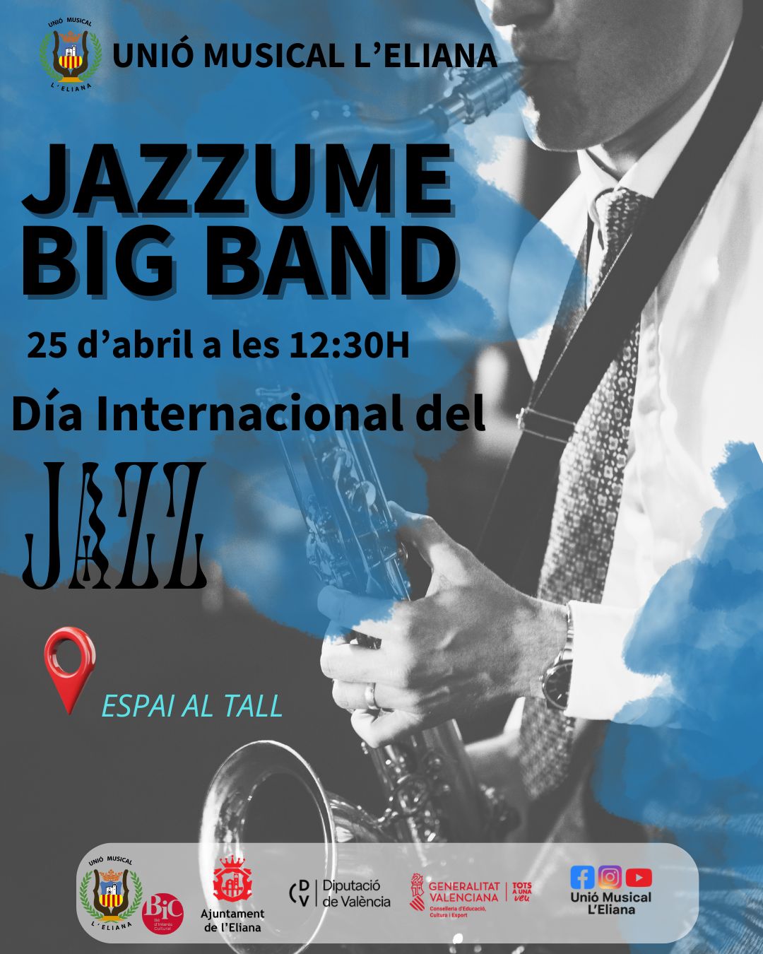 La Jazzume Big Band de la Unió Musical de L’Eliana oferirà un concert especial el pròxim 25 d’abril a les 12.30 hores amb motiu del Dia Internacional del Jazz.